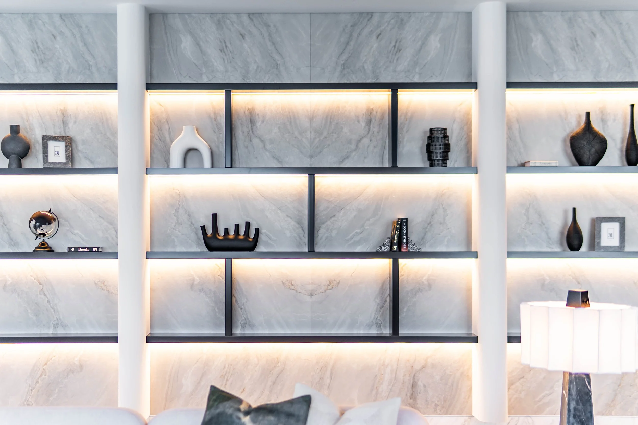The lighting—hidden LED tracks recessed behind each shelf—casts a soft wash across the stone, allowing the wall to glow, not glare.