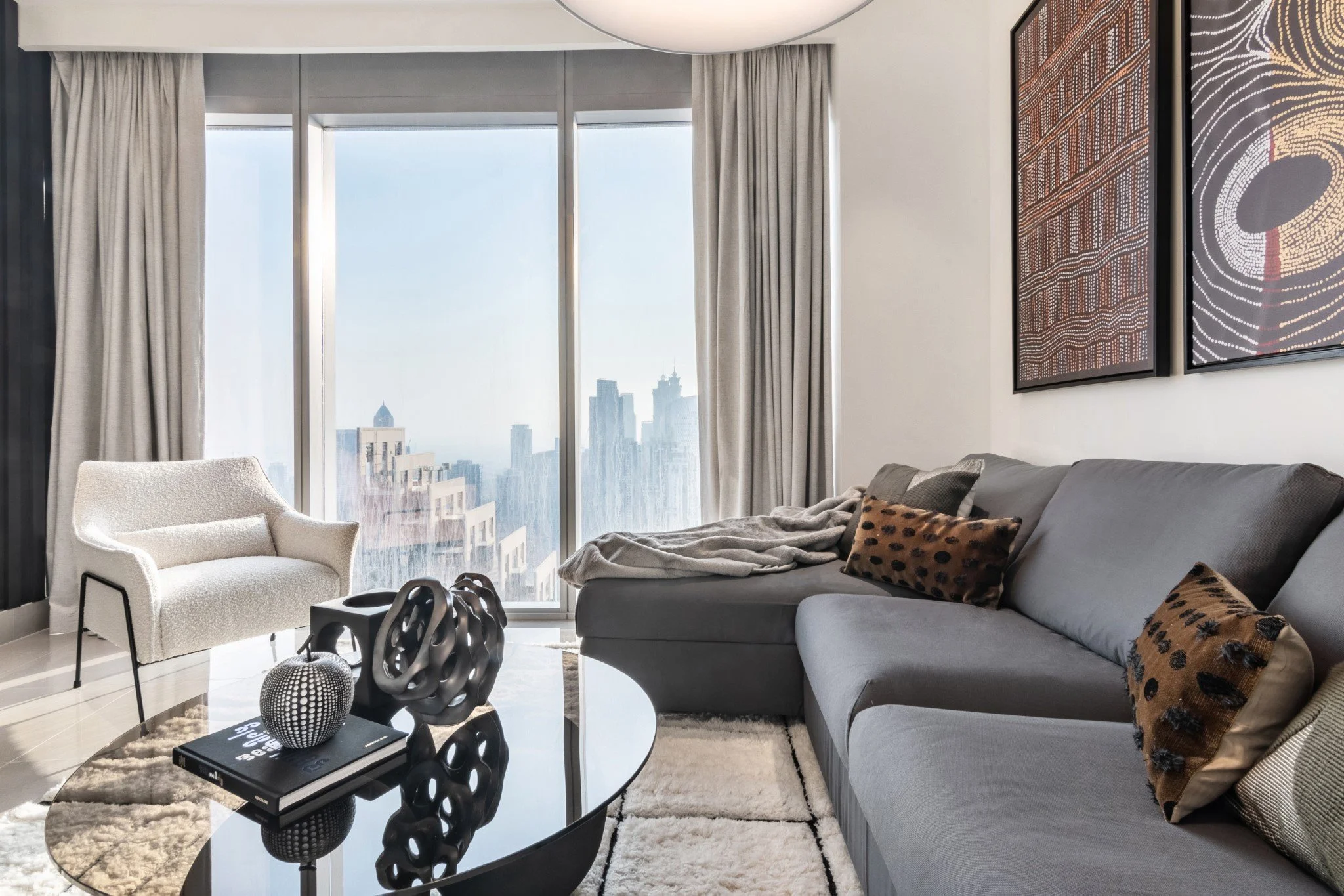 A cozy living area with a grey sectional sofa, textured cushions, and abstract art on the walls. The space is softened with light curtains and overlooks a stunning skyline through tall windows.